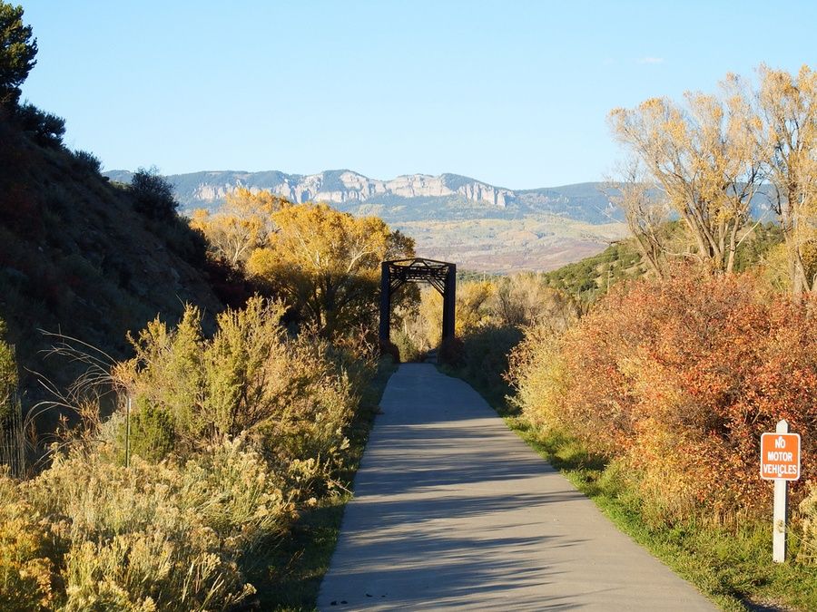 The Uncompahgre River Trail is a well-maintained concrete trail that is 5.1 miles one way so will be a 10.2 mile round trip (about 3.5 hours by foot or 70 minutes by bike). Crossing through Dennis Weaver Memorial Park, a 60-acre permanent wildlife preserve with a picnic area and sculptures, the trail ends in Ridgway State Park's Dallas Creek area with more trails, the Ridgway Reservoir, picnic areas and prime fishing spots. Along this path you'll enjoy the changing colors of the cottonwoods and river shrubbery.