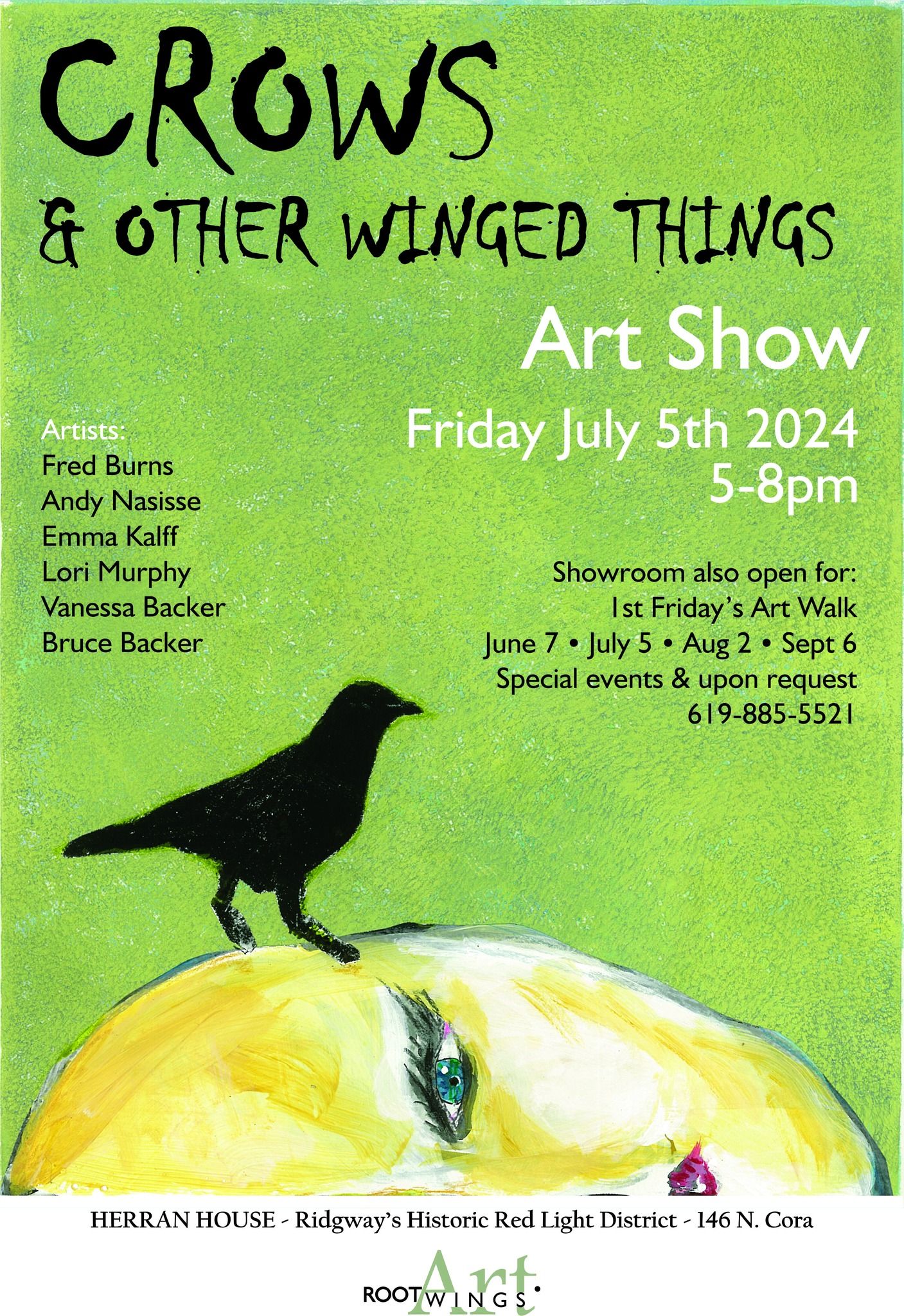 The 2024 season is featuring the theme Crows & Other Winged Things. We will be showing four renowned local artists. Ceramic artist Andy Nasisse, painter Emma Kalff and mixed media artists Vanessa & Bruce Backer. We are also showing Taos pastel painter Fred Burns and San Francisco mixed media artist Lori Murphy.